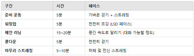 📌 초보자를 위한 달리기 루틴 (주 3~4회, 30분 기준)